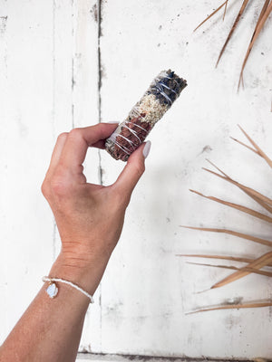 Das Salbeiräucherbündel ist gepaart mit Lavendel und Königskerze, diese unterstützen die Reinigung gerade in stressigen Zeiten, um wieder zur inneren Ruhe und Freude zu finden.